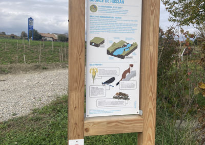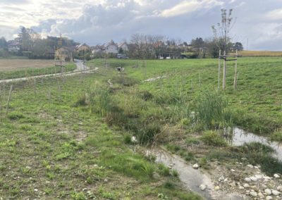 - La renaturation de la source de Rossan: notre bureau a étudié et élaboré le projet de renaturation de la source de Rossan entre le chemin du Saugey et l’arbre centenaire planté au carrefour avec la route de Denens, sur une distance d’environ 120 m. Objectif? Valoriser cette ressource, diminuer les débits transitant dans le collecteur d’eaux claires et assainir l’ancien captage d’eau potable.