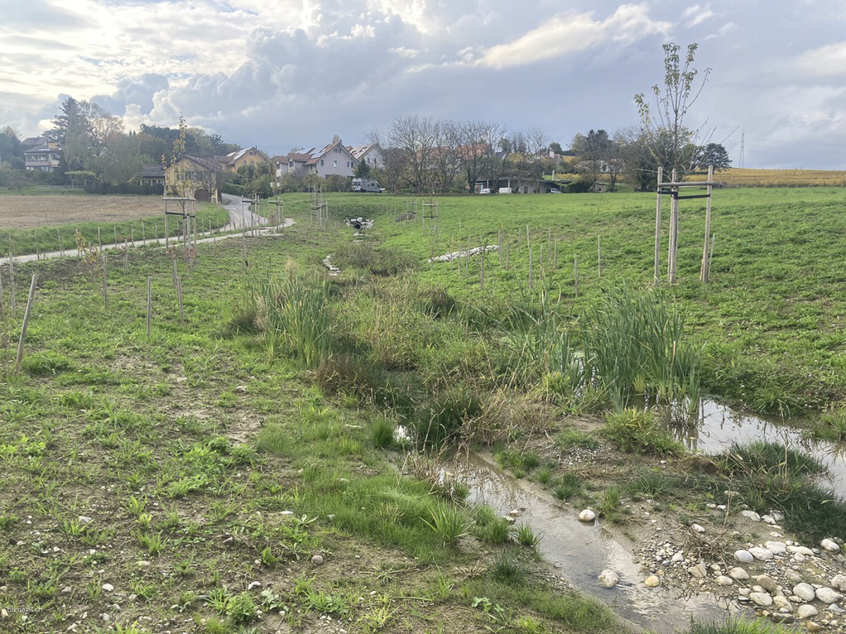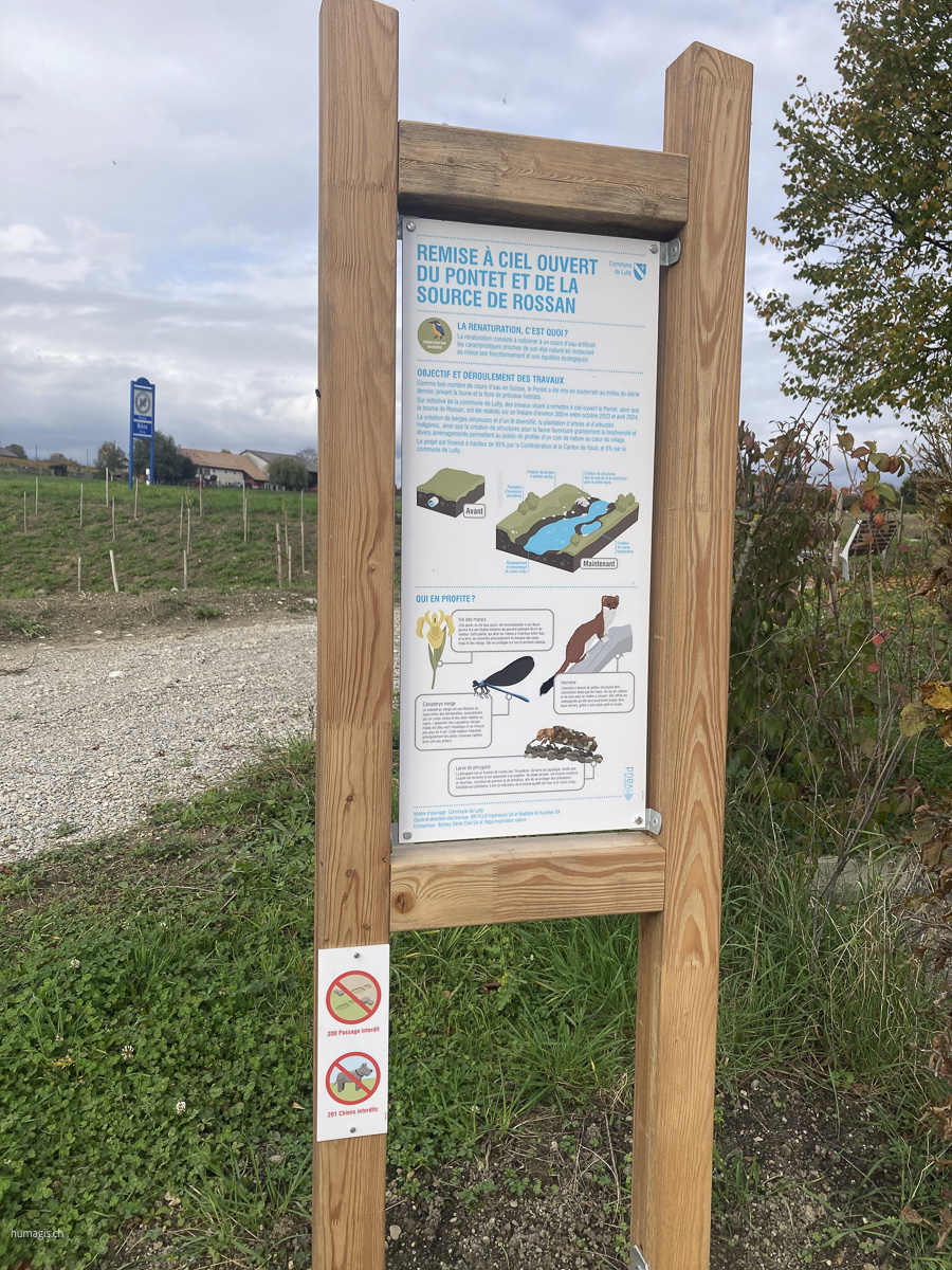 - La renaturation de la source de Rossan: notre bureau a étudié et élaboré le projet de renaturation de la source de Rossan entre le chemin du Saugey et l’arbre centenaire planté au carrefour avec la route de Denens, sur une distance d’environ 120 m. Objectif? Valoriser cette ressource, diminuer les débits transitant dans le collecteur d’eaux claires et assainir l’ancien captage d’eau potable.